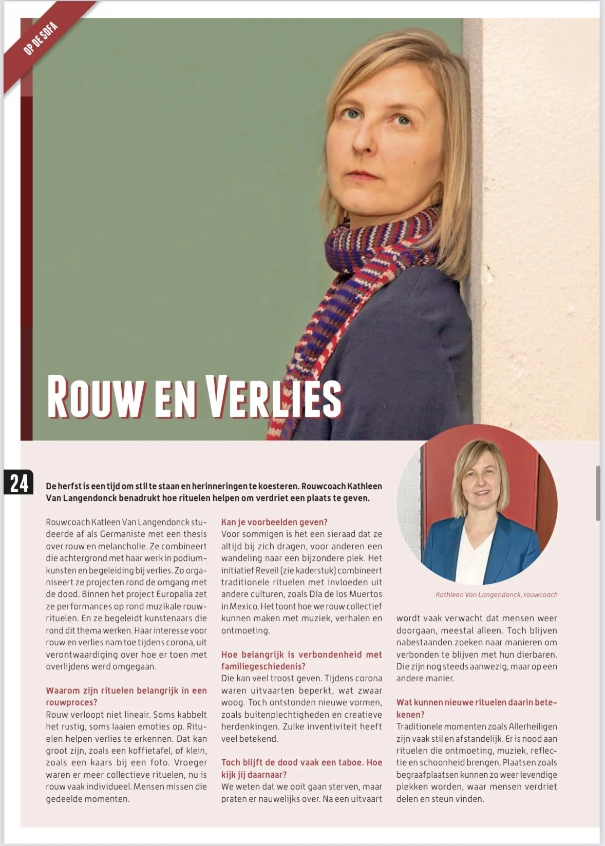 Niet dat ik iedereen aan het mediteren wil zetten, maar laten we de dood, de rouw, en het zoeken naar rouwrituelen bespreekbaarder maken. We hebben de dood te veel buiten het leven geplaatst en denken daardoor vaak dat die niet bestaat. Nochtans krijg je voor niets zoveel voorbereidingstijd. Is het dan niet vreemd dat niemand erop voorbereid is?